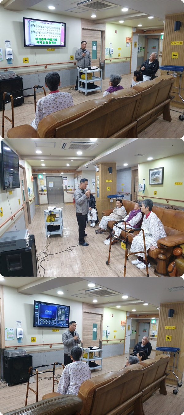 시흥 에스앤케이 요양병원에서는 주 1회 종교 활동 예배를 드리고 있습니다. 11월 둘째주 금요일 오전 4층 병동에서는 예배시간에 주 예수의 덕 외 2곡, 로마서 7장 말씀의 시간을 가졌으며, 서로 악수를 하고 인사를 주고받으며 소통의 예배시간이 되었습니다.