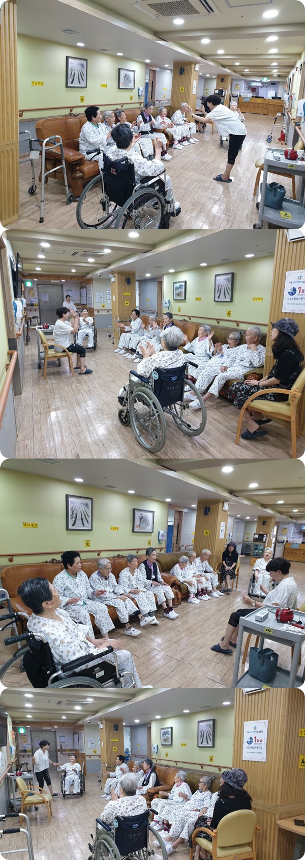 2019년 9월 웃음치료시간에는 4층 병동 어르신들과 함께 음악에 맞춰 율동, 노래하는 시간을 가져보았습니다. 평소 소극적인 어르신분들도 함께 "하하하" 웃으며, 적극적으로 율동하고 신나게 노래부르는 모습을 볼 수 있었습니다