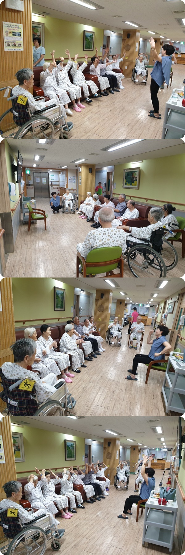 2019년 8월 웃음치료시간에는 3층 병동 어르신들과 함께 음악에 맞춰 율동, 노래하는 시간을 가져보았습니다. 평소 소극적인 어르신분들도 함께 "하하하" 웃으며, 적극적으로 율동하고 신나게 노래부르는 모습을 볼 수 있었습니다