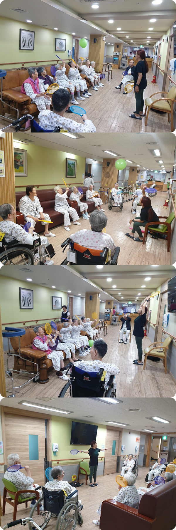 6월 셋째주 수요일 오후에도 병동에서는 건강체조가 진행되었습니다. 금일은 근력운동을 보다 효과적으로 하기 위해 풍선을 이용하여 체조가 진행되었으며 참여환자분들께서 적극적으로 참여하시는 모습을 볼 수 있었습니다,
