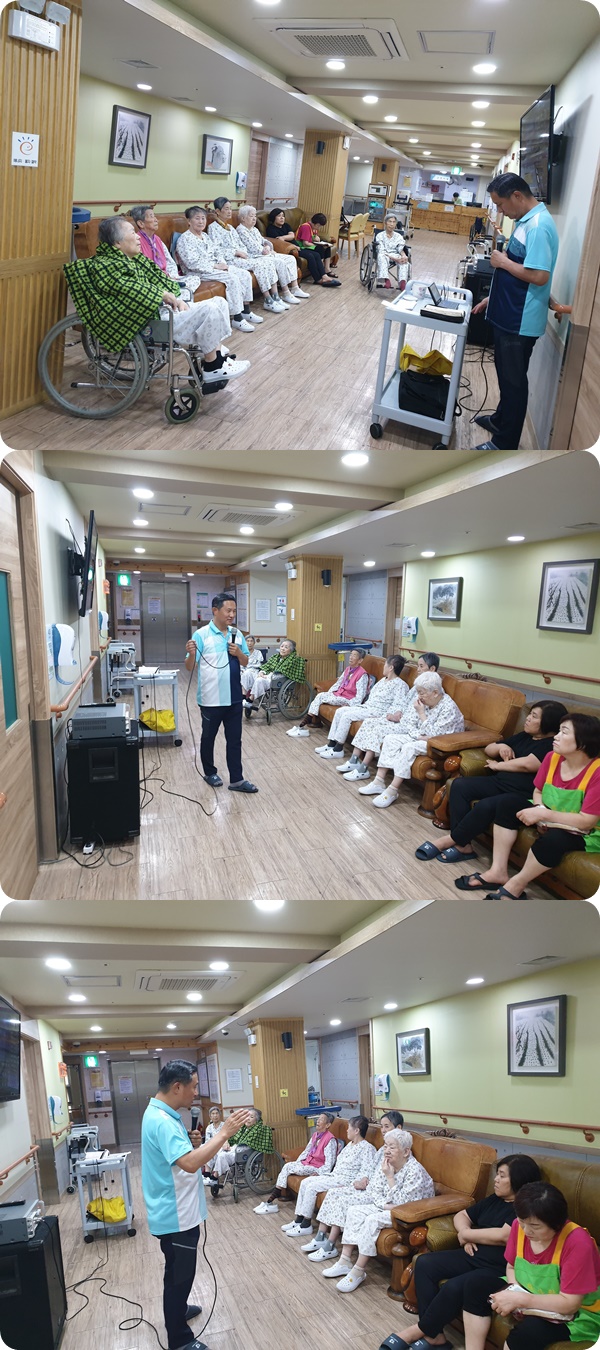 시흥 에스앤케이 요양병원에서는 주 1회 종교 활동 예배를 드리고 있습니다.6월 넷째주 금요일 오전 4층 병동에서는 예배시간에 주 예수의 덕 외 2곡, 요한복음 8장 말씀의 시간을 가졌으며, 서로 악수를 하고 인사를 주고받으며 소통의 예배시간이 되었습니다.