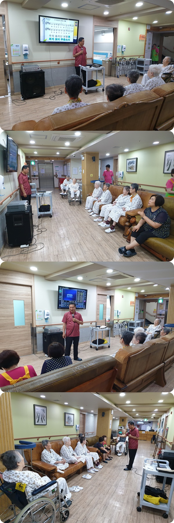 시흥 에스앤케이 요양병원에서는 주 1회 종교 활동 예배를 드리고 있습니다.7월 첫째주 금요일 오전 4층 병동에서는 예배시간에 주 예수의 덕 외 2곡, 요한복음 9장 말씀의 시간을 가졌으며, 서로 악수를 하고 인사를 주고받으며 소통의 예배시간이 되었습니다.