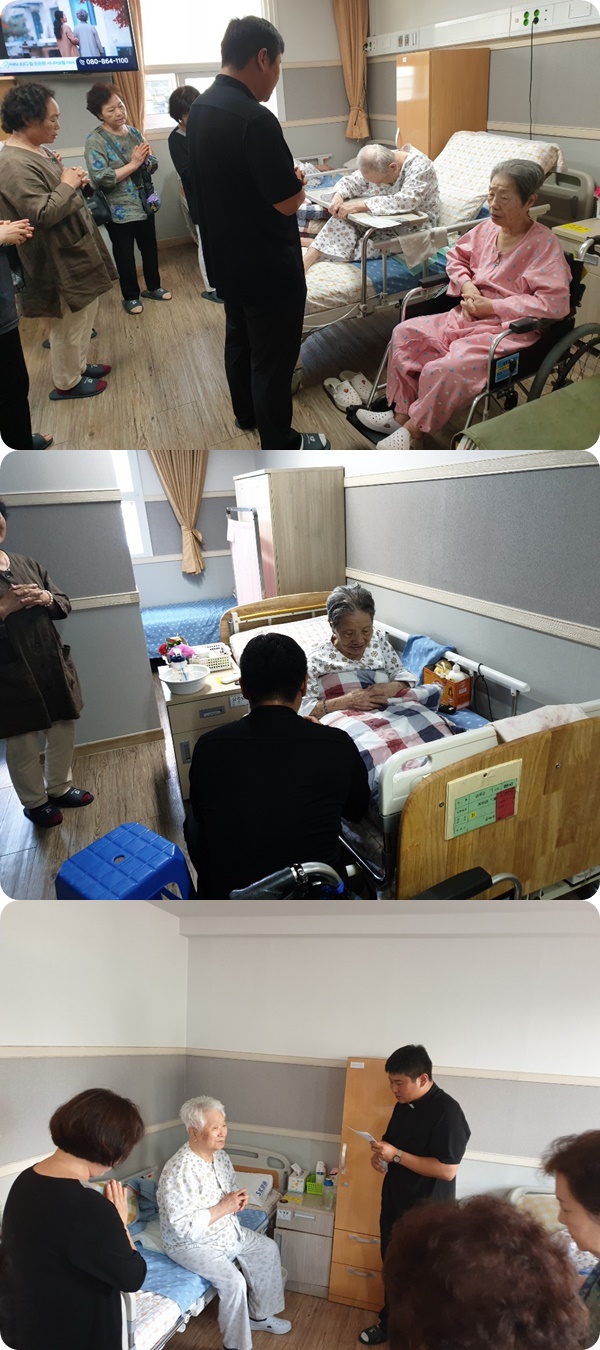 시흥 에스앤케이 요양병원은 매 월 둘째주 금요일, 성당에 다니셨던 환자분들을 위해 대야동 성당의 신부님 수녀님, 신도님들이 함께 방문하시어 환자분들을 위한 봉성체를 드리고 있습니다.