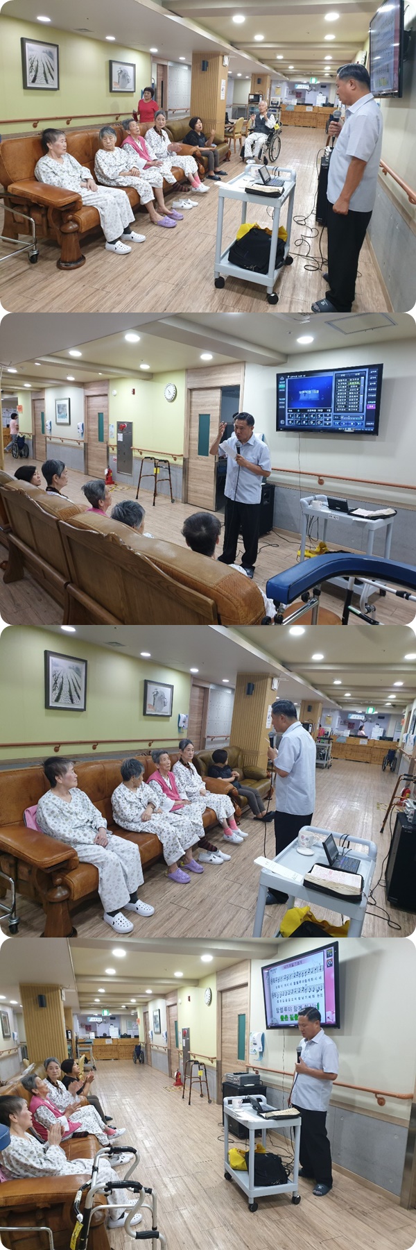 시흥 에스앤케이 요양병원에서는 주 1회 종교 활동 예배를 드리고 있습니다.7월 셋째주 금요일 오전 4층 병동에서는 예배시간에 주 예수의 덕 외 2곡, 요한복음 15장 말씀의 시간을 가졌으며, 서로 악수를 하고 인사를 주고받으며 소통의 예배시간이 되었습니다.