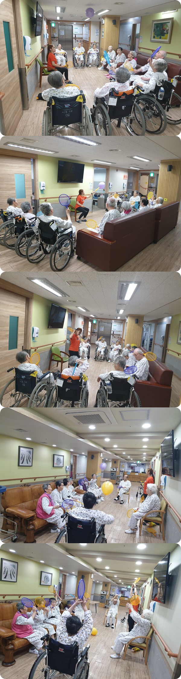 5월 다섯째주 수요일 오후에도 병동에서는 건강체조가 진행되었습니다. 금일은 근력운동을 보다 효과적으로 하기 위해 풍선을 이용하여 체조가 진행되었으며 참여환자분들께서 적극적으로 참여하시는 모습을 볼 수 있었습니다,