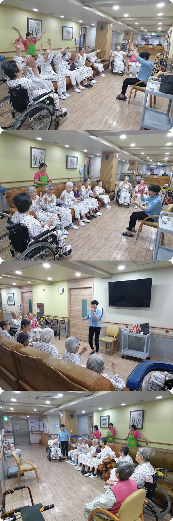 2019년 6월 웃음치료시간에는 4층 병동 어르신들과 함께 음악에 맞춰 율동, 노래하는 시간을 가져보았습니다. 평소 소극적인 어르신분들도 함께 "하하하" 웃으며, 적극적으로 율동하고 신나게 노래부르는 모습을 볼 수 있었습니다