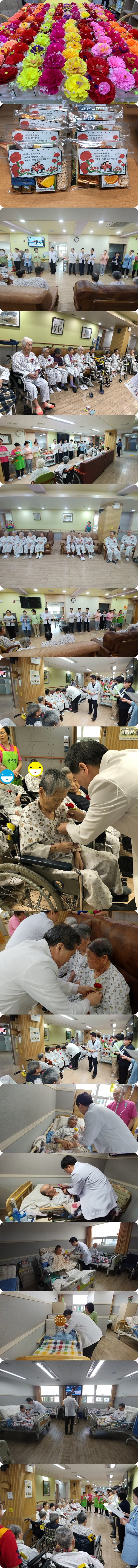 정성 어린 카네이션을 달아드리면서 건강을 기원해드렸습니다. 또한 거동이 힘드신 환자분들을 위해서는 각 병실로 찾아가 한분 한분 카네이션을 달아드리자 너무나 기뻐하시는 모습을 볼 수 있었습니다.