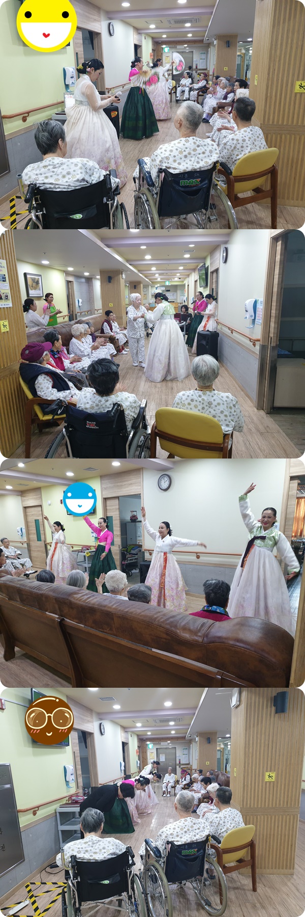 5월 , 예쁜날들 무용단에서 본원을 방문하여 환자분들에게 전통 민요와 노래, 트로트 노래메들리 등 멋진 공연을 보여주셨습니다. 트로트를 부르는 공연팀과 함께 환자분들께서 춤추고, 흥겹게 노래를 따라 부르시는 모습을 볼 수 있었습니다.
