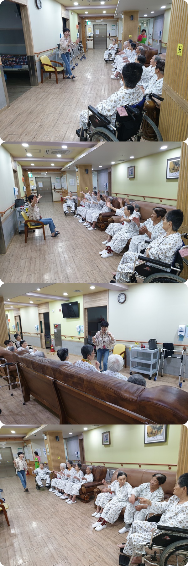2019년 5월 웃음치료시간에는 5층 병동 어르신들과 함께 음악에 맞춰 율동, 노래하는 시간을 가져보았습니다. 평소 소극적인 어르신분들도 함께 "하하하" 웃으며, 적극적으로 율동하고 신나게 노래부르는 모습을 볼 수 있었습니다