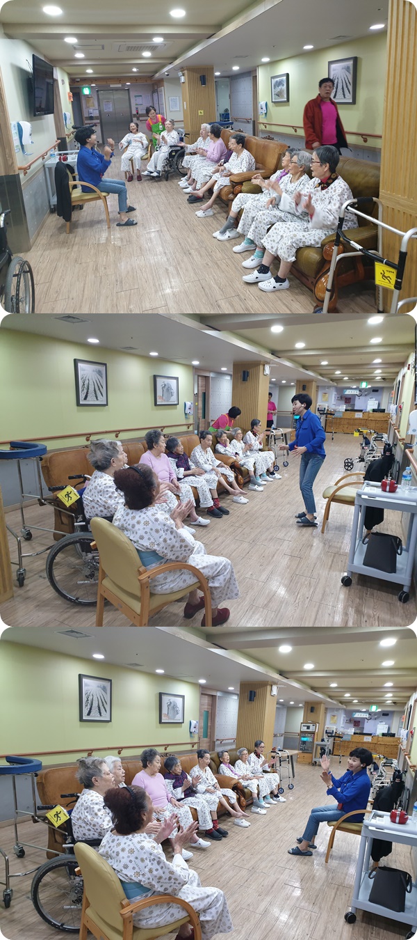 2019년 4월 웃음치료시간에는 4층 병동 어르신들과 함께 음악에 맞춰 율동, 노래하는 시간을 가져보았습니다. 평소 소극적인 어르신분들도 함께 "하하하" 웃으며, 적극적으로 율동하고 신나게 노래부르는 모습을 볼 수 있었습니다