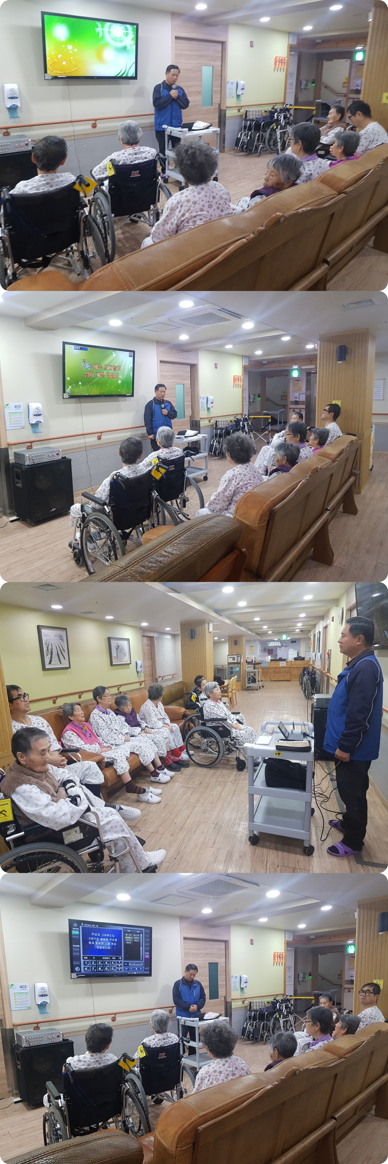 시흥 에스앤케이 요양병원에서는 주 1회 종교 활동 예배를 드리고 있습니다.3월 첫째주 금요일 오전 4층 병동에서는 예배시간에 예수 십자가 흘린 보혈로 외 4곡, 요한일시 3장 말씀의 시간을 가졌으며, 서로 악수를 하고 인사를 주고받으며 소통의 예배시간이 되었습니다.