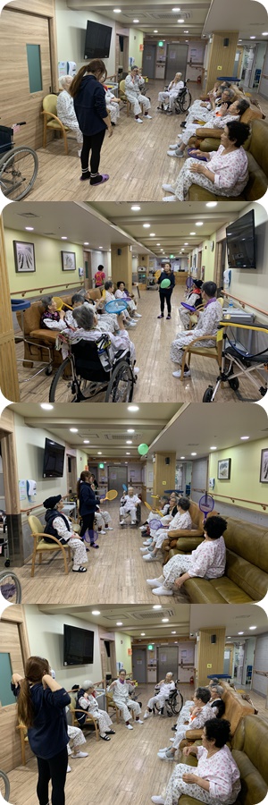 3월 셋째주 수요일 오후에도 병동에서는 건강체조가 진행되었습니다. 금일은 근력운동을 보다 효과적으로 하기 위해 풍선을 이용하여 체조가 진행되었으며 참여환자분들께서 적극적으로 참여하시는 모습을 볼 수 있었습니다,