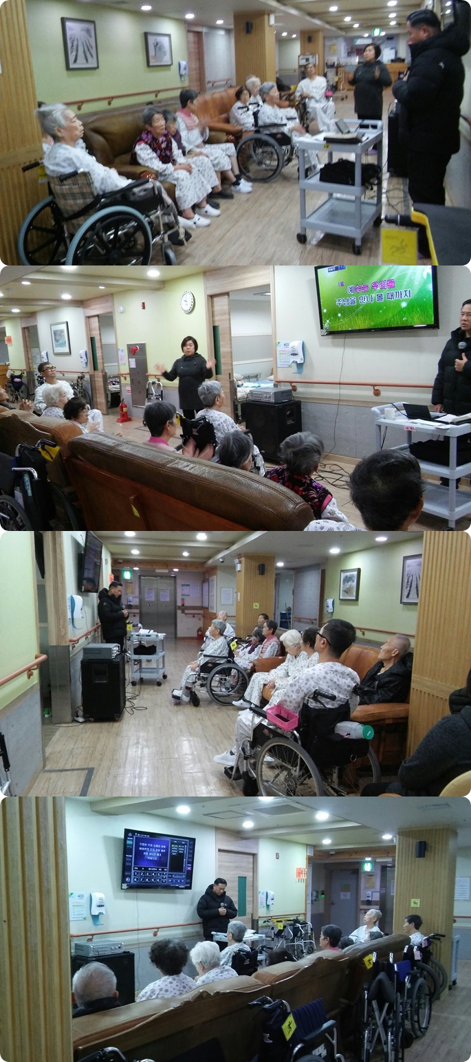 시흥SK요양병원에서는 주 1회 종교 활동 예배를 드리고 있습니다.12월 셋째주 금요일 오전 4층 병동에서는 예배시간에주의 음성 들으니 외 4곡 베드로전서 4장 말씀의 시간을 가졌으며, 서로 악수를 하고 인사를 주고받으며 소통의 예배시간이 되었습니다.