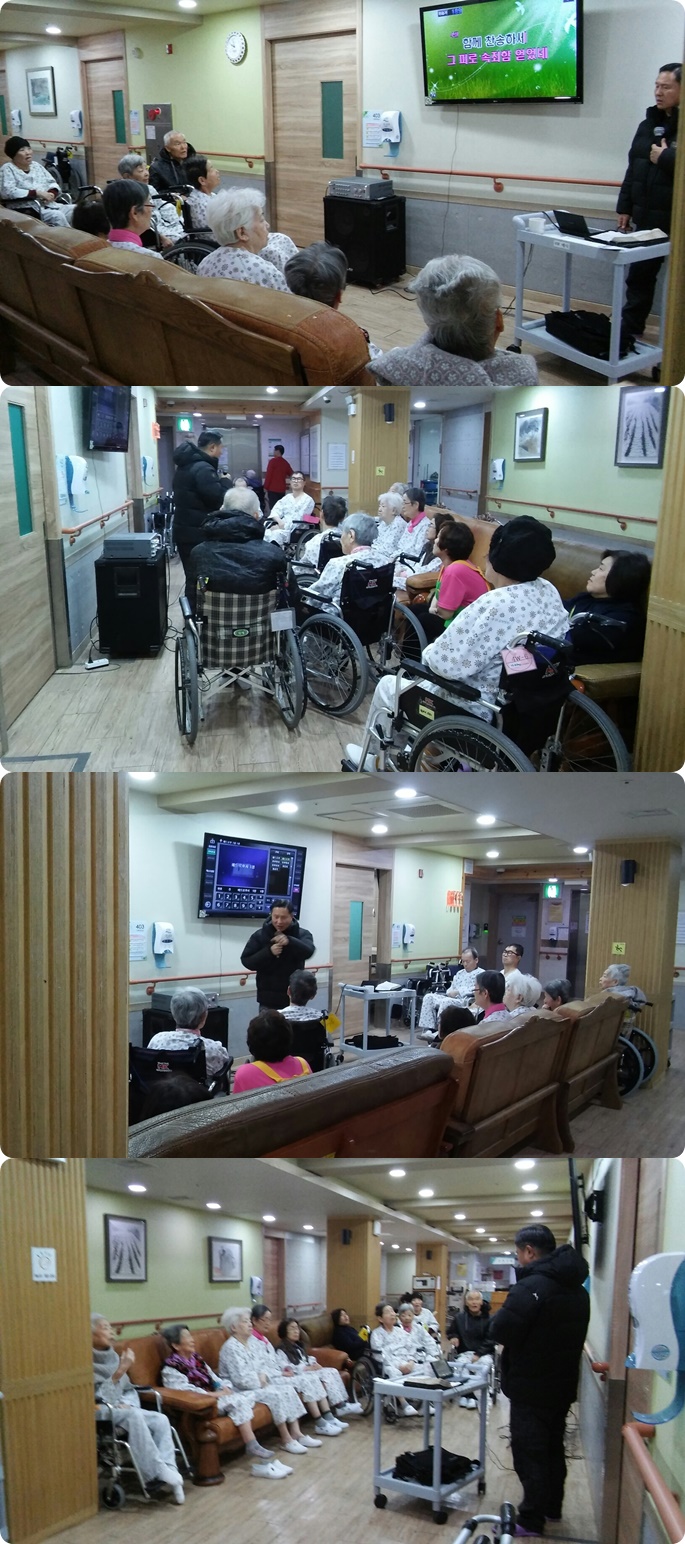 시흥SK요양병원에서는 주 1회 종교 활동 예배를 드리고 있습니다.1월 첫째주 금요일 오전 4층 병동에서는 예배시간에 예수 십자가 흘린 보혈로 외 4곡 베드로후서 1장 말씀의 시간을 가졌으며, 서로 악수를 하고 인사를 주고받으며 소통의 예배시간이 되었습니다.