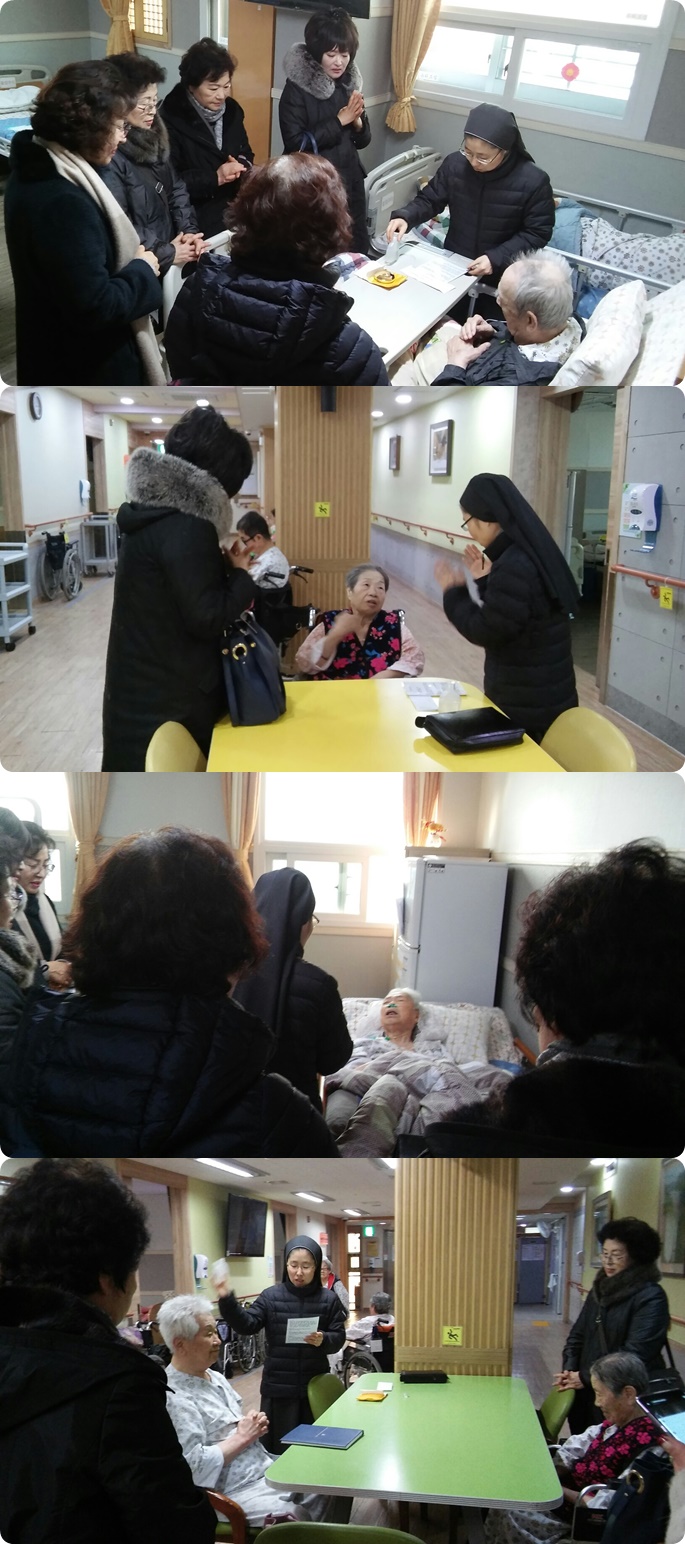 1월달 시흥SK요양병원 매월 둘째주 금요일에는 시흥시 관내 거주하시는 환자분들 중 성당에 다니셨던 환자분들을 위해 대야동 성당의 신부님 수녀님, 신도님들이 함께 방문하시어 환자분들을 위한 봉성체를 월 1회 드리고 있습니다.