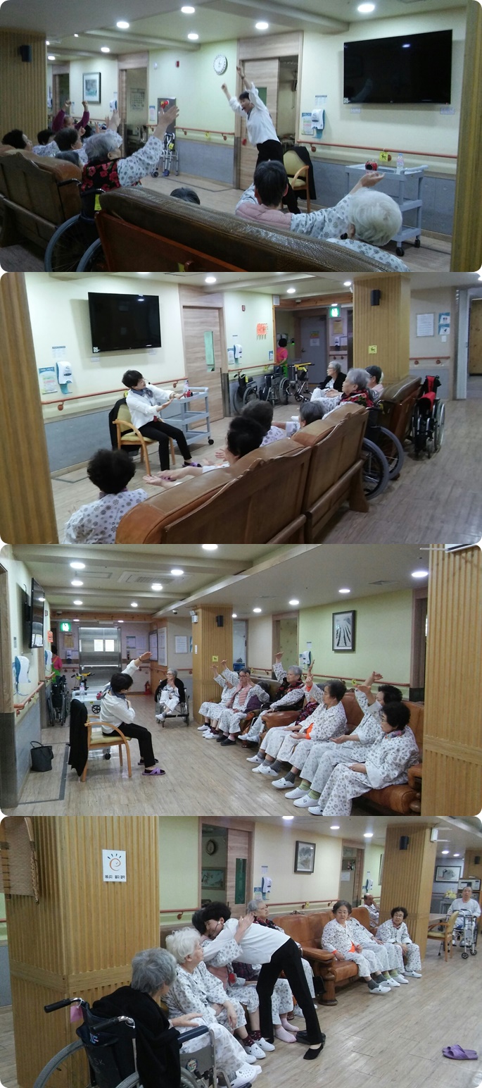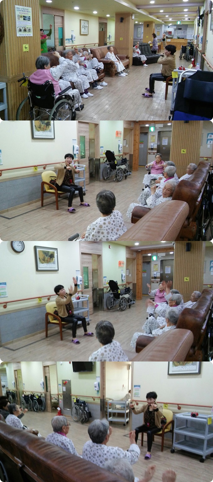 2018-11월달에 웃음치료시간에는 4.5층 병동 어르신들과 함께 음악에 맞춰 율동, 노래하는 시간을 가져보았습니다. 평소 소극적인 어르신분들도 함께 "하하하" 웃으며, 적극적으로 율동하고 신나게 노래부르는 모습을 볼 수 있었습니다.