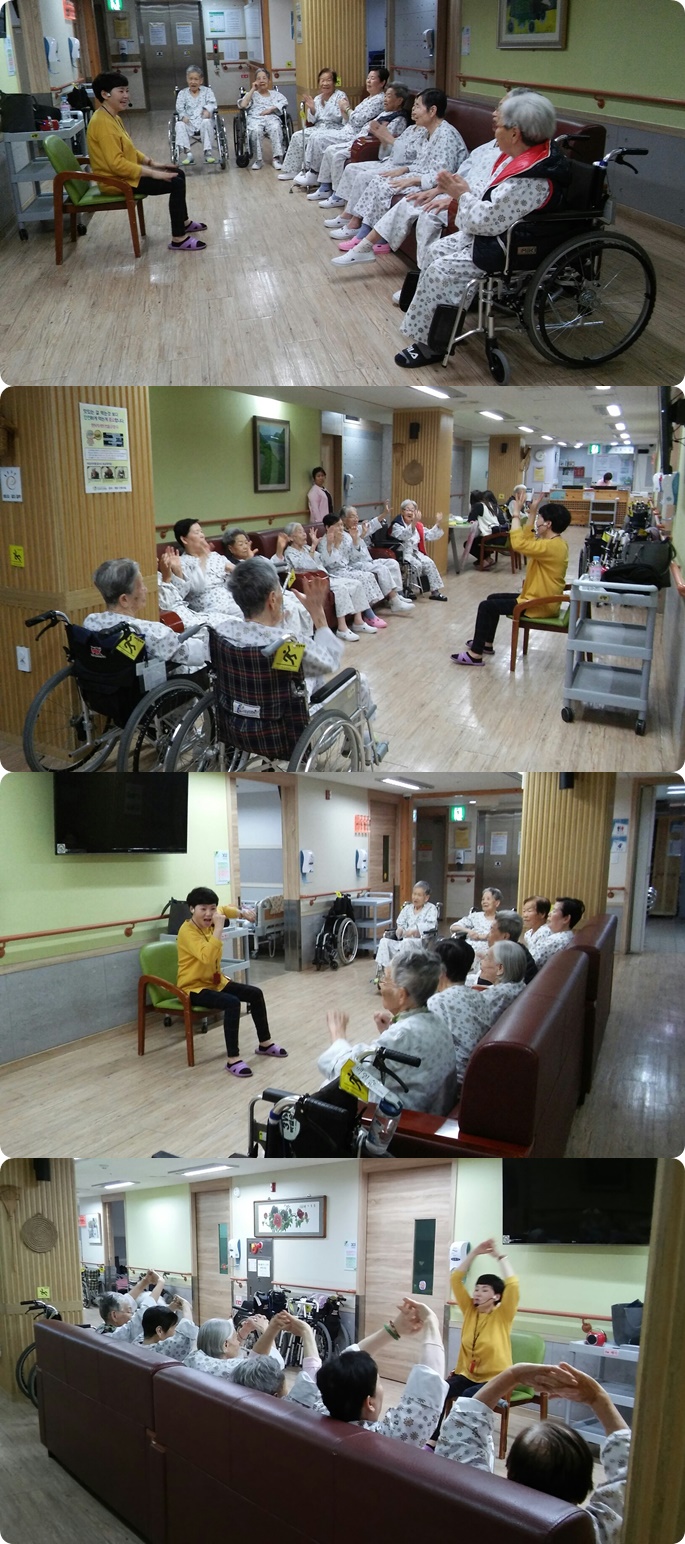 2018-12월달에 웃음치료시간에는 3,4,5층 병동 어르신들과 함께 음악에 맞춰 율동, 노래하는 시간을 가져보았습니다. 평소 소극적인 어르신분들도 함께 "하하하" 웃으며, 적극적으로 율동하고 신나게 노래부르는 모습을 볼 수 있었습니다.