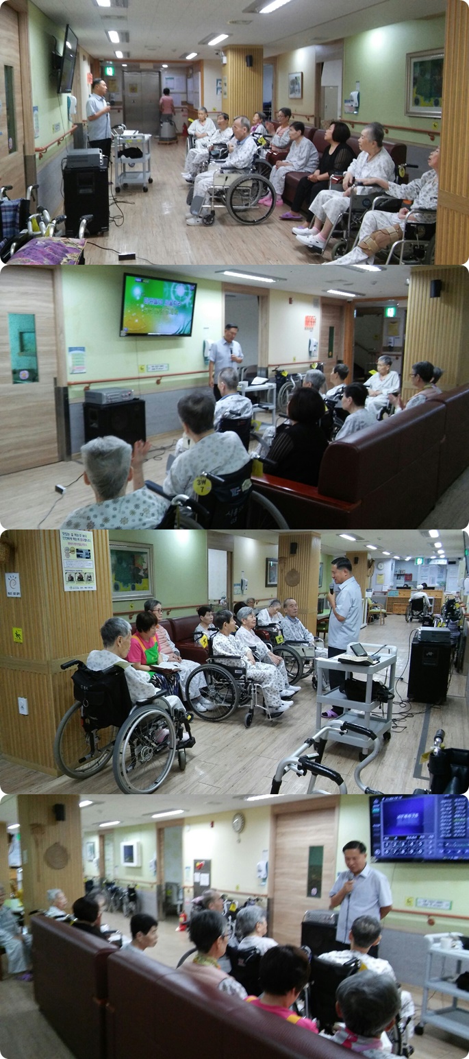 시흥SK요양병원에서는 주 1회 종교 활동 예배를 드리고 있습니다.9월 둘째주 금요일 오전 3층 병동에서는 예배시간에 영광 영광 할레루야 외 4곡 골로세서 2장 말씀의 시간을 가졌으며, 서로 악수를 하고 인사를 주고받으며 소통의 예배시간이 되었습니다.