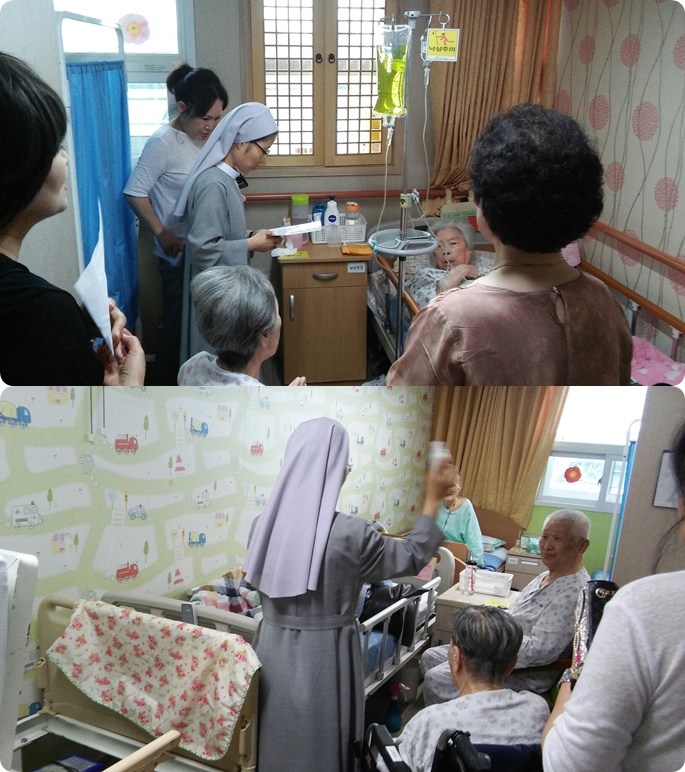 7월달 시흥SK요양병원 매월 둘째주 금요일에는 시흥시 관내 거주하시는 환자분들 중 성당에 다니셨던 환자분들을 위해 대야동 성당의 신부님 수녀님, 신도님들이 함께 방문하시어 환자분들을 위한 봉성체를 월 1회 드리고 있습니다.