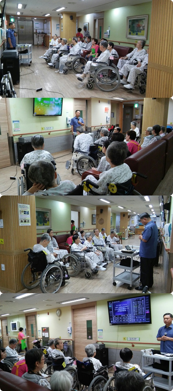 시흥SK요양병원에서는 주 1회 종교 활동 예배를 드리고 있습니다.7월 두번째주 금요일 오전 3층 병동에서는 예배시간에 주의 보혈로 외 4곡고린도전서 3장 말씀의 시간을 가졌으며, 서로 악수를 하고 인사를 주고받으며 소통의 예배시간이 되었습니다.
