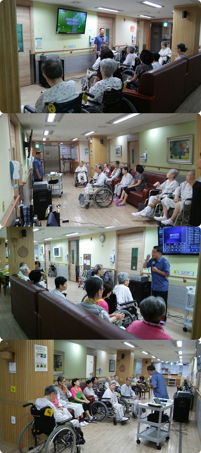 시흥SK요양병원에서는 주 1회 종교 활동 예배를 드리고 있습니다.8월 두번째주 금요일 오전 3층 병동에서는 예배시간에 나의 갈길 다 가도로 외 4곡 에베소서 1장 말씀의 시간을 가졌으며, 서로 악수를 하고 인사를 주고받으며 소통의 예배시간이 되었습니다.