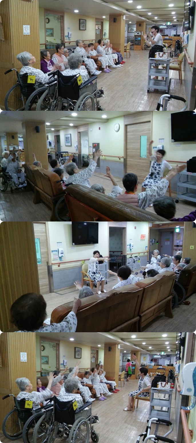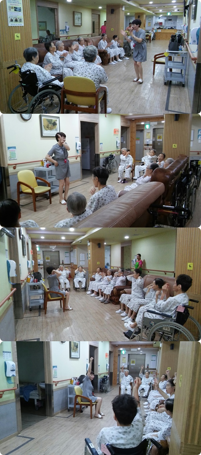 2018-09월달에 웃음치료시간에는 4.5층 병동 어르신들과 함께 음악에 맞춰 율동, 노래하는 시간을 가져보았습니다. 평소 소극적인 어르신분들도 함께 "하하하" 웃으며, 적극적으로 율동하고 신나게 노래부르는 모습을 볼 수 있었습니다.