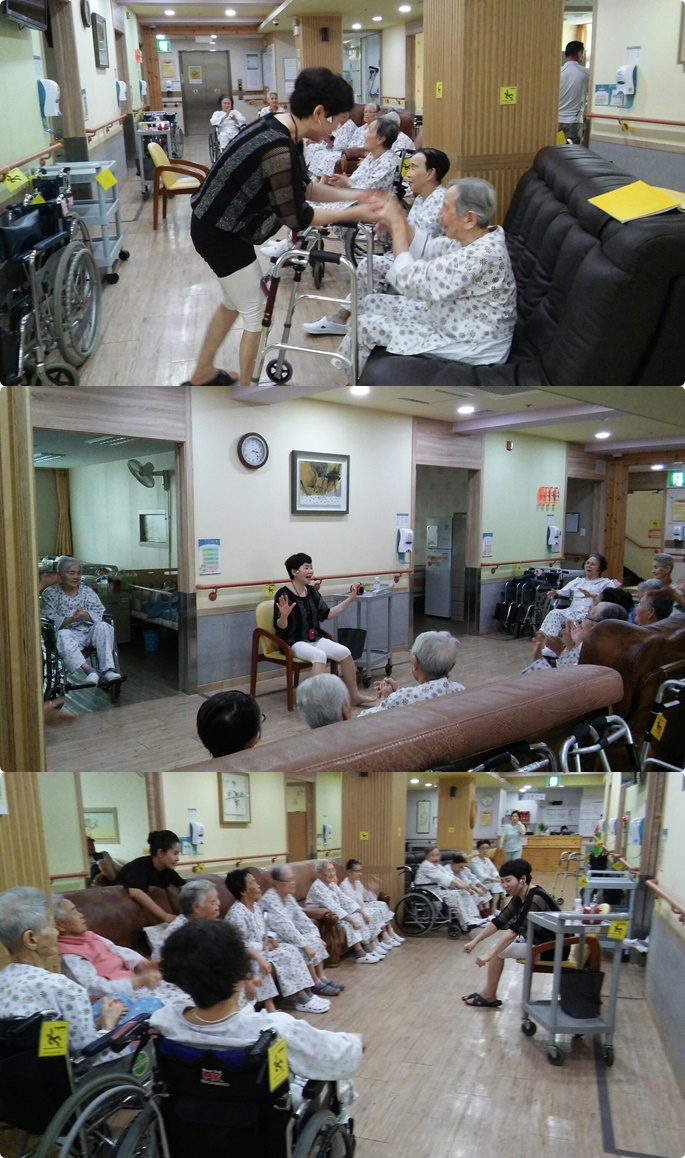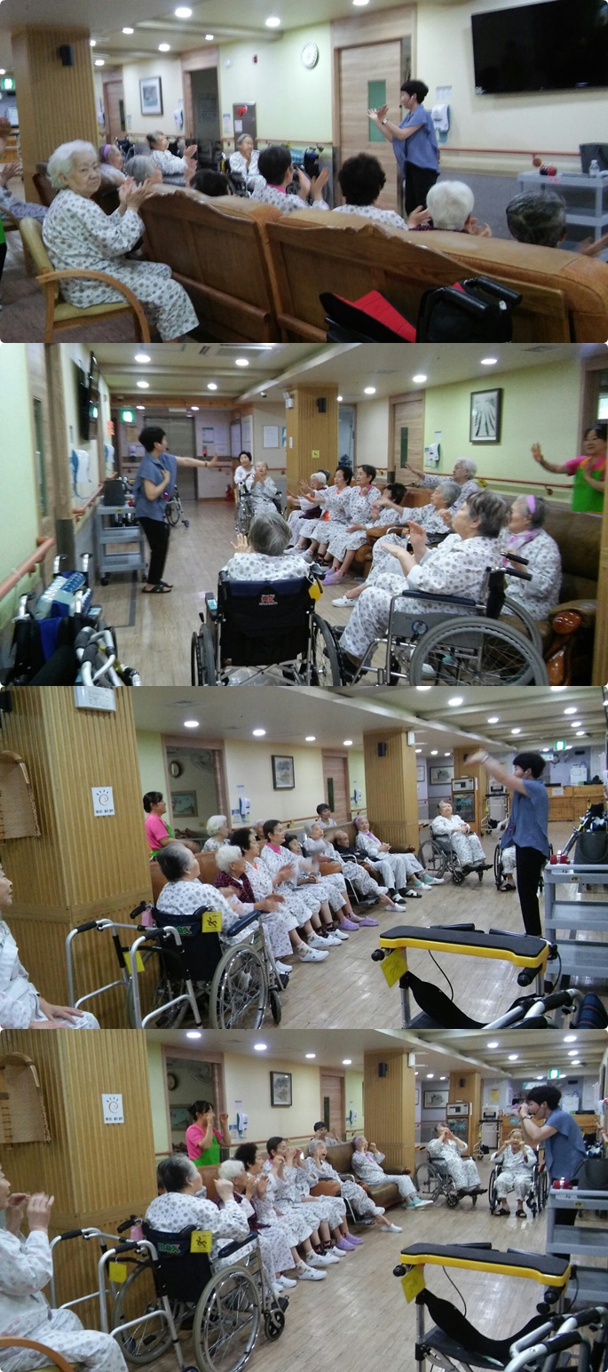 2018-06월달에 웃음치료시간에는3, 4,5층 병동 어르신들과 함께 음악에 맞춰 율동, 노래하는 시간을 가져보았습니다. 평소 소극적인 어르신분들도 함께 "하하하" 웃으며, 적극적으로 율동하고 신나게 노래부르는 모습을 볼 수 있었습니다.