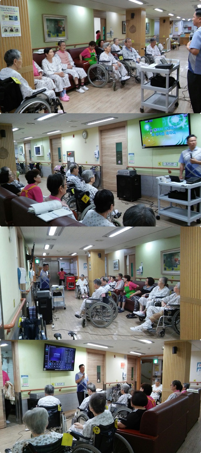 시흥SK요양병원에서는 주 1회 종교 활동 예배를 드리고 있습니다.6월 세번째주 금요일 오전 3층 병동에서는 예배시간에 행군 나팔소리로 외4곡 누가복음 6장 말씀의 시간을 가졌으며, 서로 악수를 하고 인사를 주고받으며 소통의 예배시간이 되었습니다.