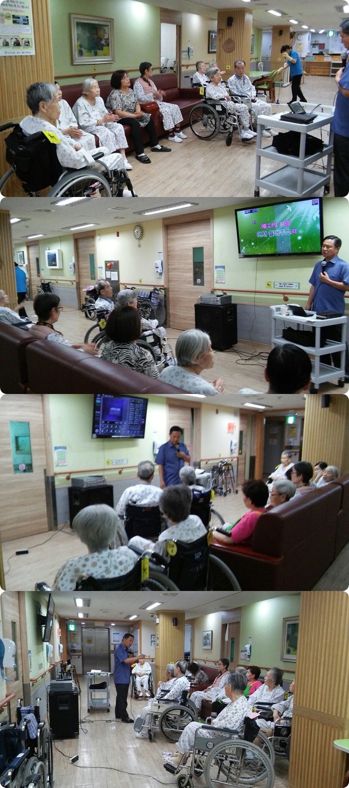 시흥SK요양병원에서는 주 1회 종교 활동 예배를 드리고 있습니다.7월 첫번째주 금요일 오전 3층 병동에서는 예배시간에 예수의 사랑 외 4곡 고린도전서 5장말씀의 시간을 가졌으며, 서로 악수를 하고 인사를 주고받으며 소통의 예배시간이 되었습니다.