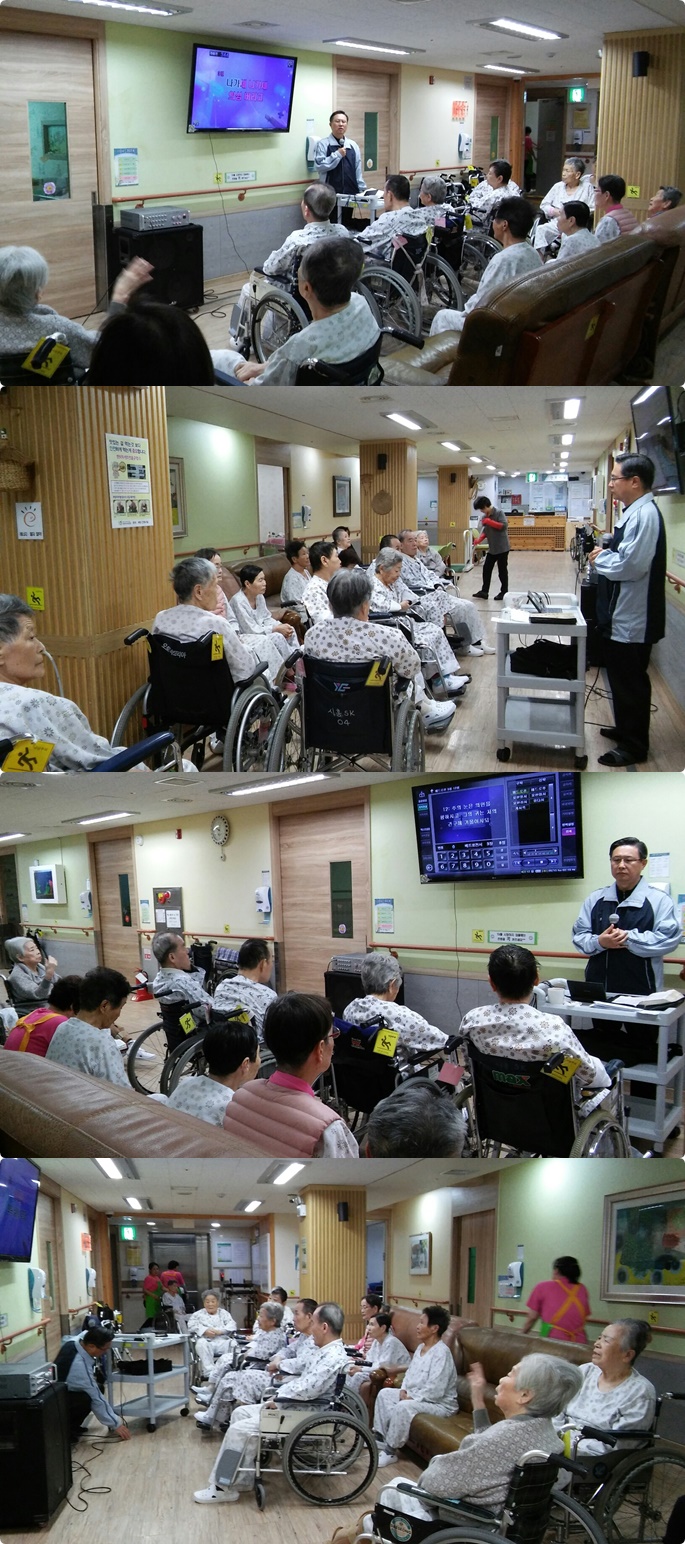 시흥SK요양병원에서는 주 1회 종교 활동 예배를 드리고 있습니다.4월 첫번째주 금요일 오전 3층 병동에서는 예배시간에 이 눈에 증거 아니 뵈어도 외4곡, 베드로전서 3장 말씀의 시간을 가졌으며, 서로 악수를 하고 인사를 주고받으며 소통의 예배시간이 되었습니다.