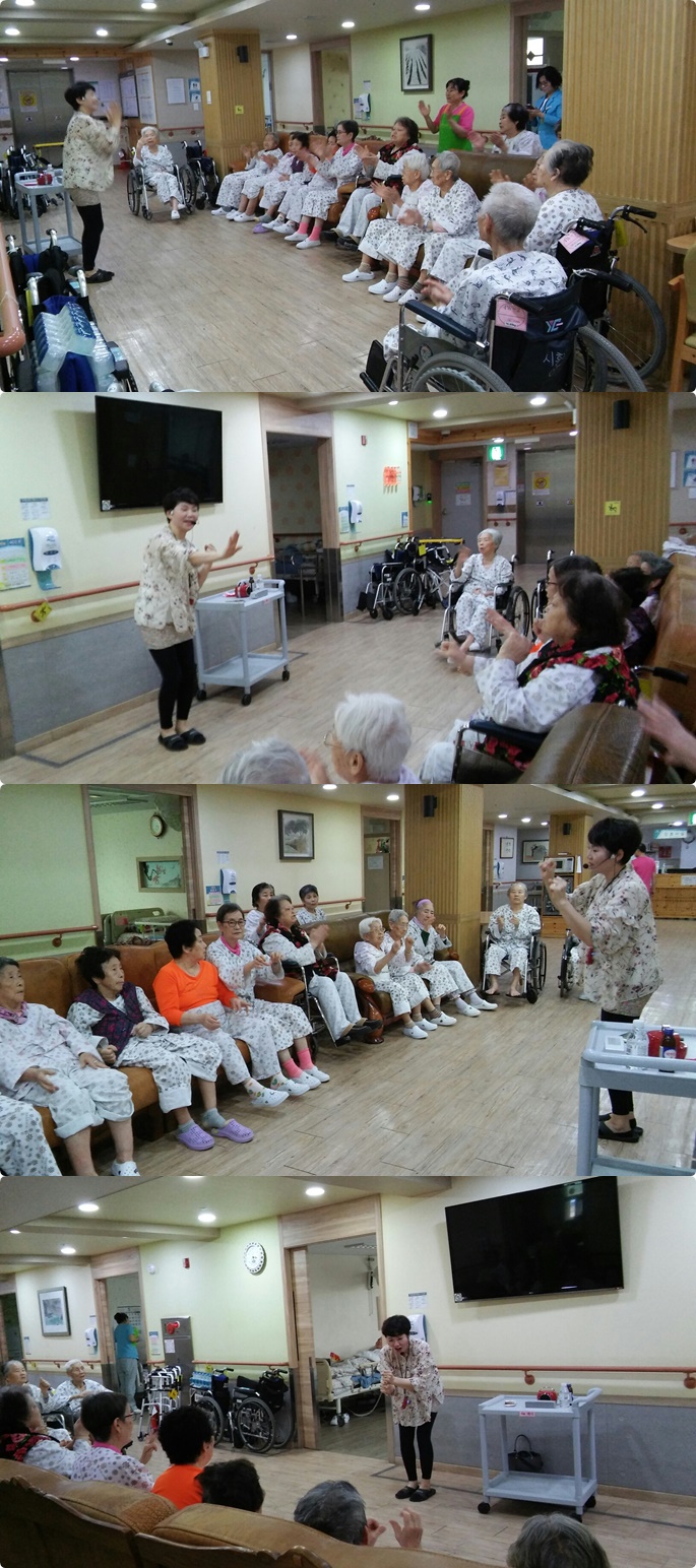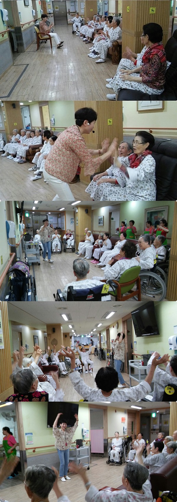 2018-05월달에 웃음치료시간에는 3,4,5층 병동 어르신들과 함께 음악에 맞춰 율동, 노래하는 시간을 가져보았습니다. 평소 소극적인 어르신분들도 함께 "하하하" 웃으며, 적극적으로 율동하고 신나게 노래부르는 모습을 볼 수 있었습니다.