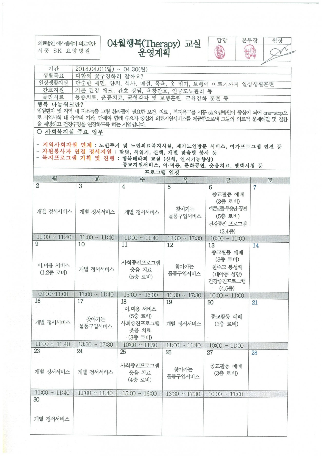 4월 행복테라피 운영계획표 입니다.