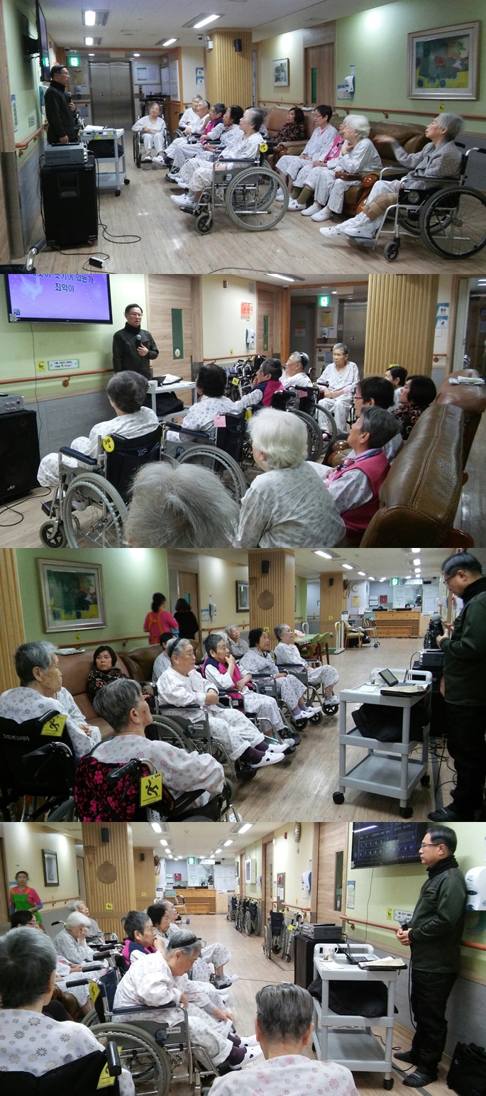 시흥SK요양병원에서는 주 1회 종교 활동 예배를 드리고 있습니다.12월 다섯번째 주 금요일 오전 3층 병동에서는 예배시간에는 구주의 십자가 보혈로 이외의4곡,고린도전서 15장 말씀의 시간을 가졌으며, 서로 악수를 하고 인사를 주고받으며 소통의 예배시간이 되었습니다.