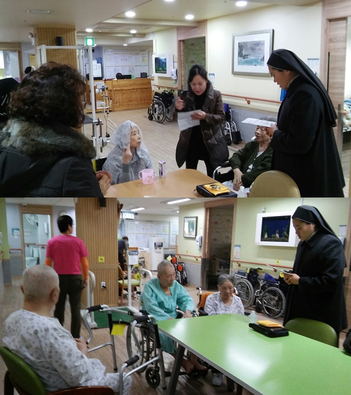 시흥SK요양병원 매월 둘째주 금요일에는 시흥시 관내 거주하시는 환자분들 중 성당에 다니셨던 환자분들을 위해 대야동 성당의 신부님 수녀님, 신도님들이 함께 방문하시어 환자분들을 위한 봉성체를 월 1회 드리고 있습니다.
