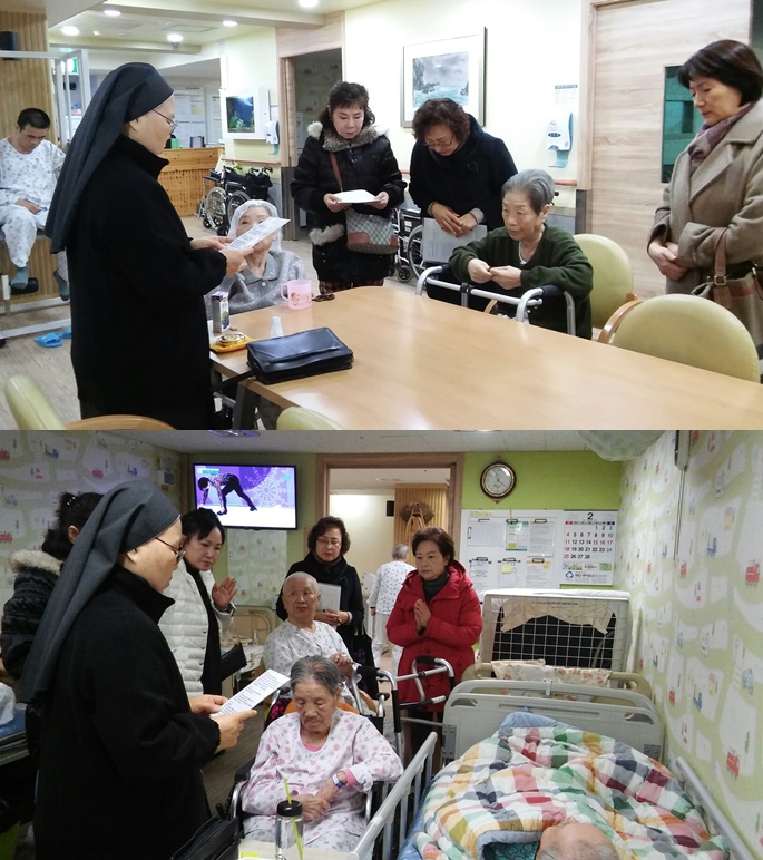 2월달 시흥SK요양병원 매월 둘째주 금요일에는 시흥시 관내 거주하시는 환자분들 중 성당에 다니셨던 환자분들을 위해 대야동 성당의 신부님 수녀님, 신도님들이 함께 방문하시어 환자분들을 위한 봉성체를 월 1회 드리고 있습니다.