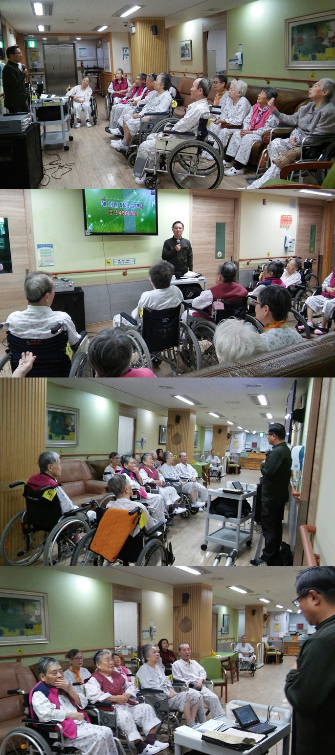 시흥SK요양병원에서는 주 1회 종교 활동 예배를 드리고 있습니다.11월 셋째주 금요일 오전 3층 병동에서는 예배시간에는 나 같은 죄인 살리신 외4곡, 에베소서 5장 말씀의 시간을 가졌으며, 서로 악수를 하고 인사를 주고받으며 소통의 예배시간이 되었습니다.