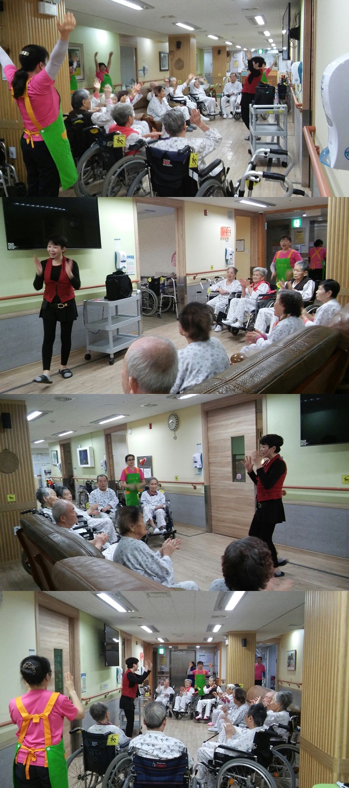 2017년 12월달 웃음치료시간에는3층 병동 어르신들과 함께 음악에 맞춰 율동, 노래하는 시간을 가져보았습니다. 평소 소극적인 어르신분들도 함께 "하하하" 웃으며, 적극적으로 율동하고 신나게 노래부르는 모습을 볼 수 있었습니다.