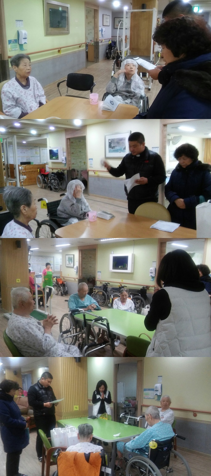 시흥SK요양병원 매월 첫째주 목요일에는 시흥시 관내 거주하시는 환자분들 중 성당에 다니셨던 환자분들을 위해 대야동 성당의 신부님 수녀님, 신도님들이 함께 방문하시어 환자분들을 위한 봉성체를 월 1회 드리고 있습니다.