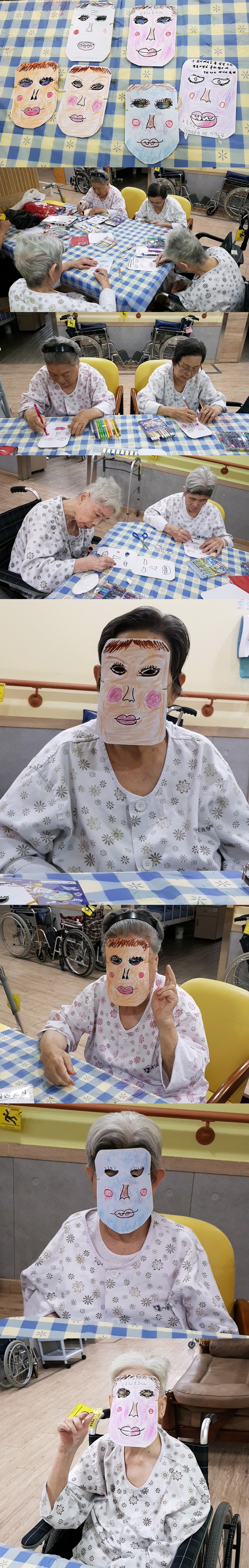 환자분들께서 직접 얼굴과 코, 입술 색을 고르는 과정을 통해 자율성을 키우고, 가면에 색을 칠하고 직접 고무줄을 연결하여 손의 근력을 향상시키는 활동이 될 수 있었습니다. 그리고 함께 완성된 가면을 써보고 젊은 시절에 대해 담소를 나누며 즐거운 시간을 보냈습니다.