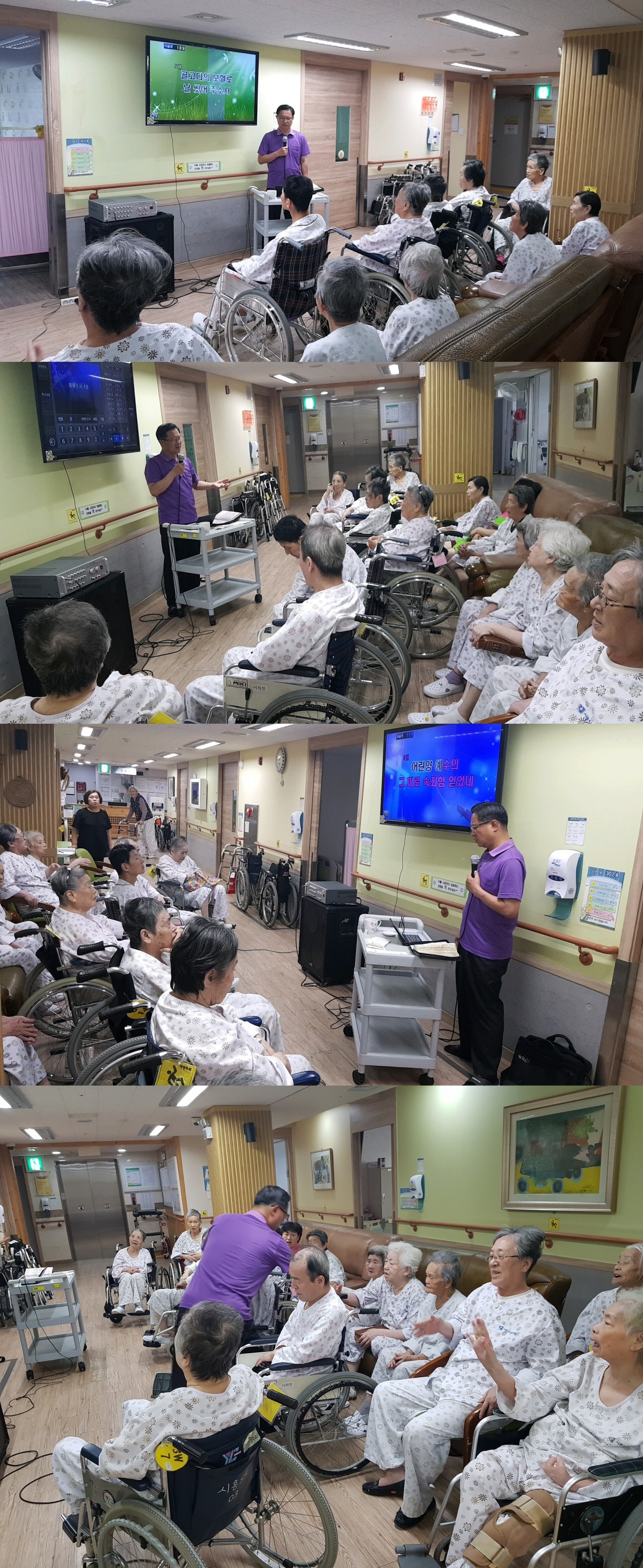시흥SK요양병원에서는 주 1회 종교 활동 예배를 드리고 있습니다. 7월 둘째주 금요일 오전 3층 병동에서는 예배시간에는 ‘마음에 가득한 의심을 깨치고’ 찬송 외 4곡과 에베소서 4장 말씀의 시간을 가졌으며 힘께 찬송하고 설교말씀을 들으며 즐거운 예배 시간을 보냈습니다.