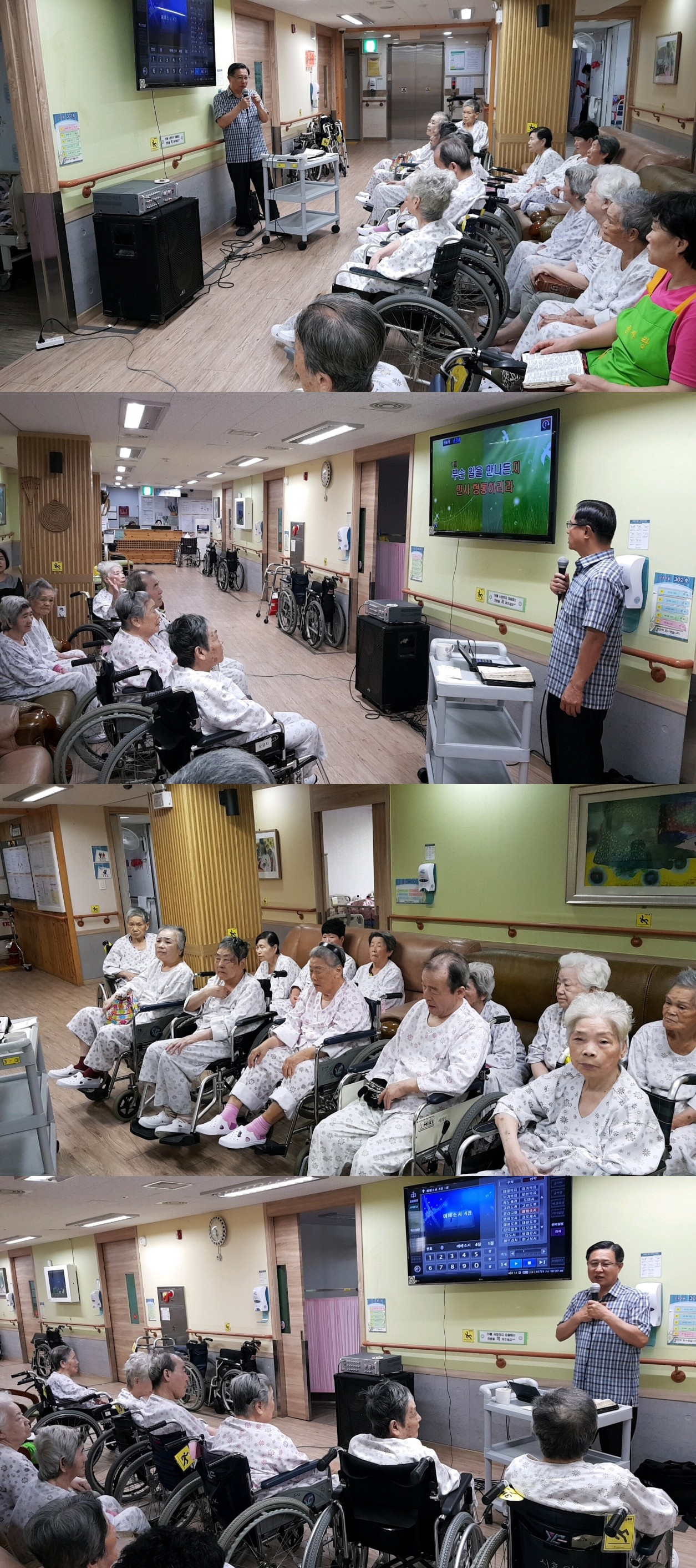 시흥SK요양병원에서는 주 1회 종교 활동 예배를 드리고 있습니다. 7월 셋째주 금요일 오전 3층 병동에서는 예배시간에는 ‘주의 곁에 있을 때’ 찬송 외 4곡과 에베소서 4장 말씀의 시간을 가졌으며, 서로 악수를 하고 “사랑합니다”라는 말을 주고받으며 소통의 예배시간이 되었습니다.