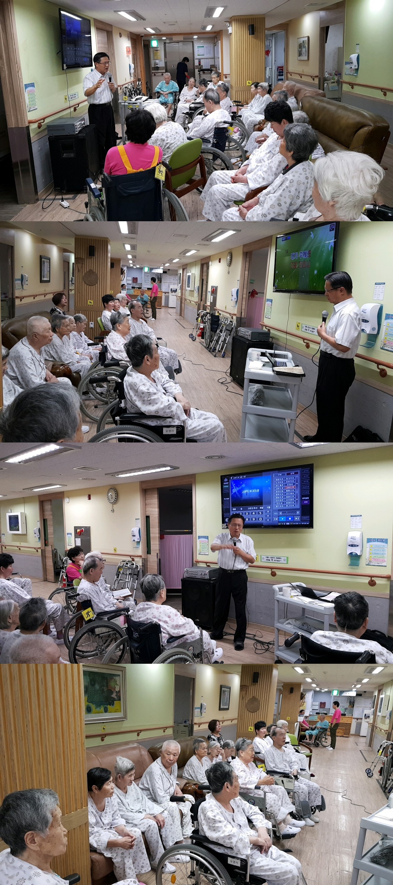 시흥SK요양병원에서는 주 1회 종교 활동 예배를 드리고 있습니다. 7월 마지막주 금요일 오전 3층 병동에서는 예배시간에는 ‘내 너를 위하여’ 찬송 외 4곡과 고린도후서 5장 말씀의 시간을 가졌으며, 서로 악수를 하고 인사를 주고받으며 소통의 예배시간이 되었습니다.