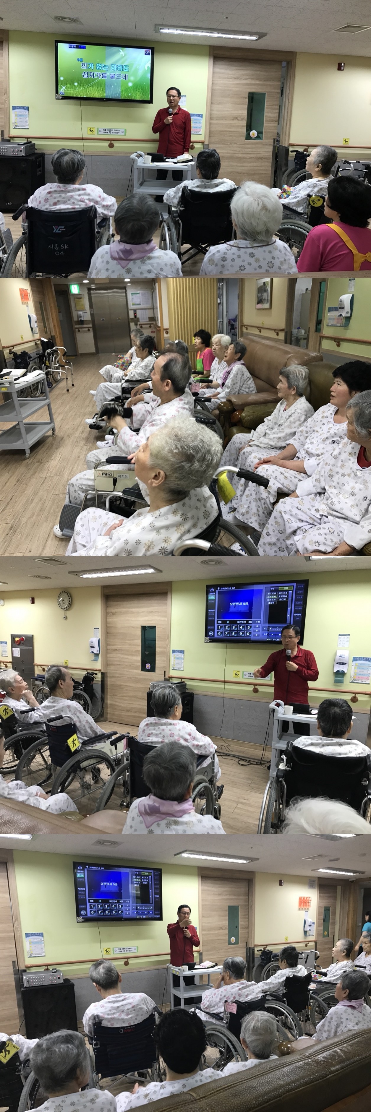 시흥SK요양병원에서는 주 1회 종교 활동 예배를 드리고 있습니다. 5월 넷째주 예배시간에는 ‘행군 나팔소리로’ 찬송 외 5곡과 요한 일서 5장 말씀의 시간을 가졌으며 참여한 환자분들 과 함께 열정적인 예배시간이 될 수 있었습니다.