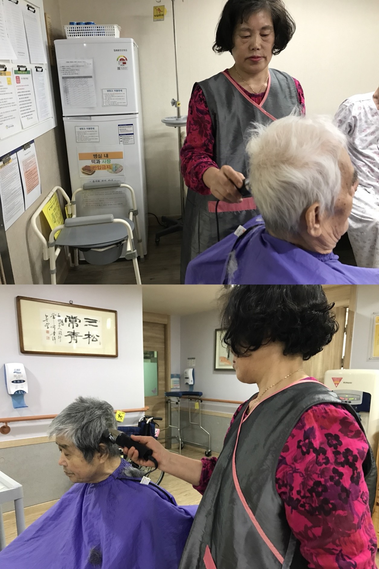 2017년 시흥SK요양병원 4월 이.미용 서비스가 진행되었습니다. 4월 따뜻한 봄날씨가 가득한 가운데 환자분들의 청결한 두발 상태를 위한 이.미용 서비스를 진행하였습니다. 또한 환자분들의 개별 욕구에 따라 알맞은 이.미용 서비스가 진행되며 만족도 높은 미용서비스가 진행될 수 있었습니다.