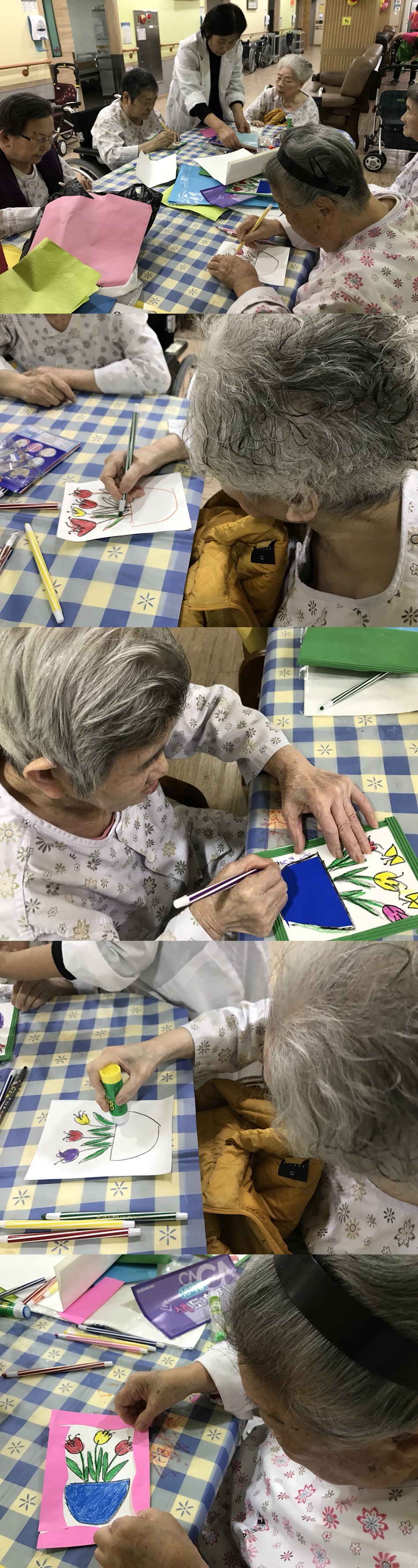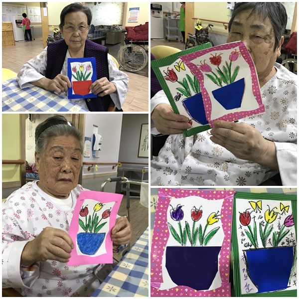 색도화지에 튤립을 원하는 색상을 칠하고 색종이를 이용하여 틀을 꾸며주는 시간을 가졌습니다. 완성된 튤립 액자를 보고 참여 환자분들께서는 꽃피는 “봄”을 느낄 수 있었다며 너무나 좋아하시는 모습을 볼 수 있었습니다.