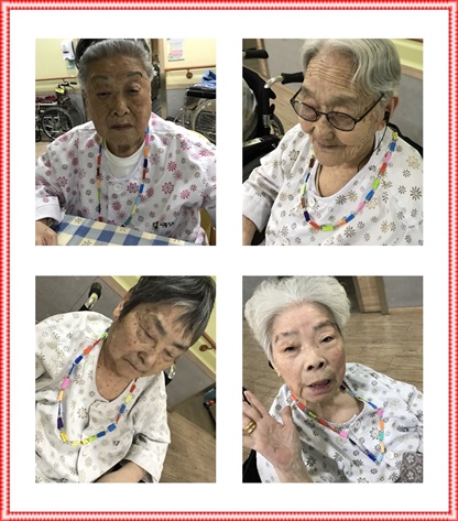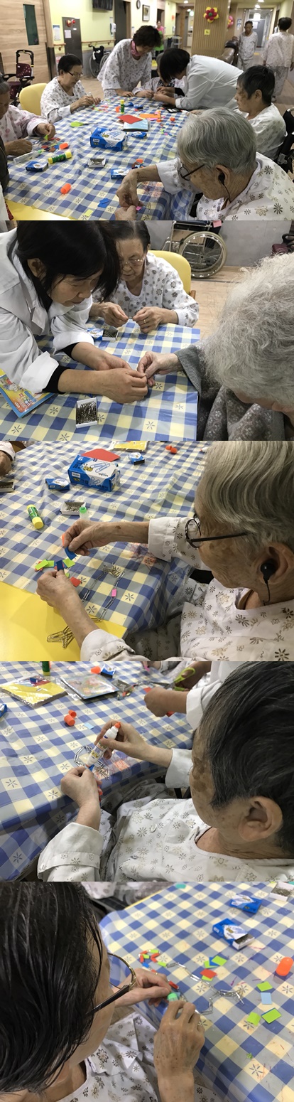 2017년 4월 셋째주 미술프로그램 시간에는 “나만의 목걸이”를 만들어 보는 시간을 가졌습니다. 클립을 이어서 목걸이 형태를 만들고 다양한 색종이에 풀을 붙여 목걸이를 꾸며 나가는 시간을 가졌습니다. 환자들의 손 소·근육을 움직이기 위한 활동으로 환자분들께서 적극적으로 프로그램에 참여하는 모습을 볼 수 있었습니다.