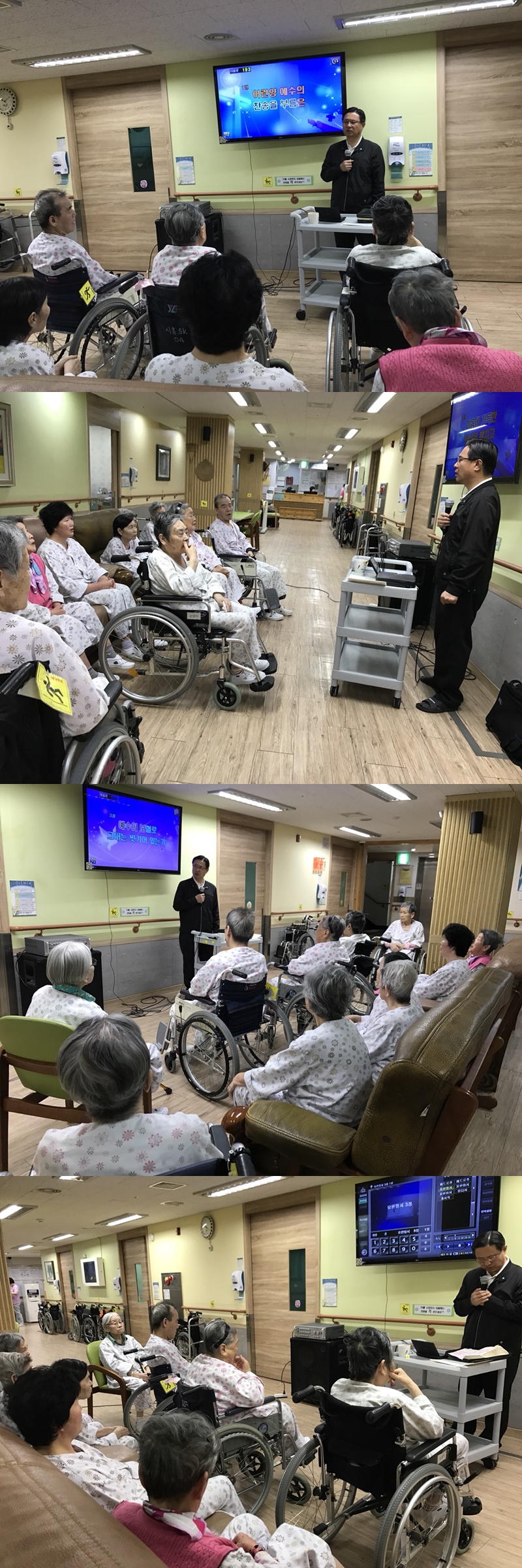 시흥SK요양병원에서는 주 1회 종교 활동 예배를 드리고 있습니다. 4월 마지막 주 예배시간에는 요한일서 3장 말씀과 ‘예수의 보혈로’ 외 5곡의 찬송들을 통하여 환자분들과 함께하는 예배 시간이 되면서 열정적인 예배시간이 될 수 있었습니다.