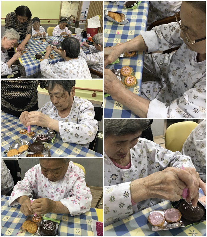 2017년 5월 가정의 달 둘째주 미술시간에는 “초콜릿으로 미니 케이크 만들기”를 주제로 초콜릿 시럽으로 준비된 초코파이와, 체크 과자에 색깔이 입혀진 (화이트, 초코, 딸기) 시럽으로 위에다가 다양하게 꾸며보는 시간을 가졌습니다. 초코로 알록달록하게 꾸며진 과자와 초코파이는 환자분들에게 인기 만점이였습니다! 집중도도 너무나 높으셨으며 개인의 취향에 맞게 꾸미시는 모습을 볼 수 있었습니다. ! 또한 완성된 초코파이와 과자는 다른 환자분들과도 나눠드시며 화기애애한 시간이 될 수 있었습니다.