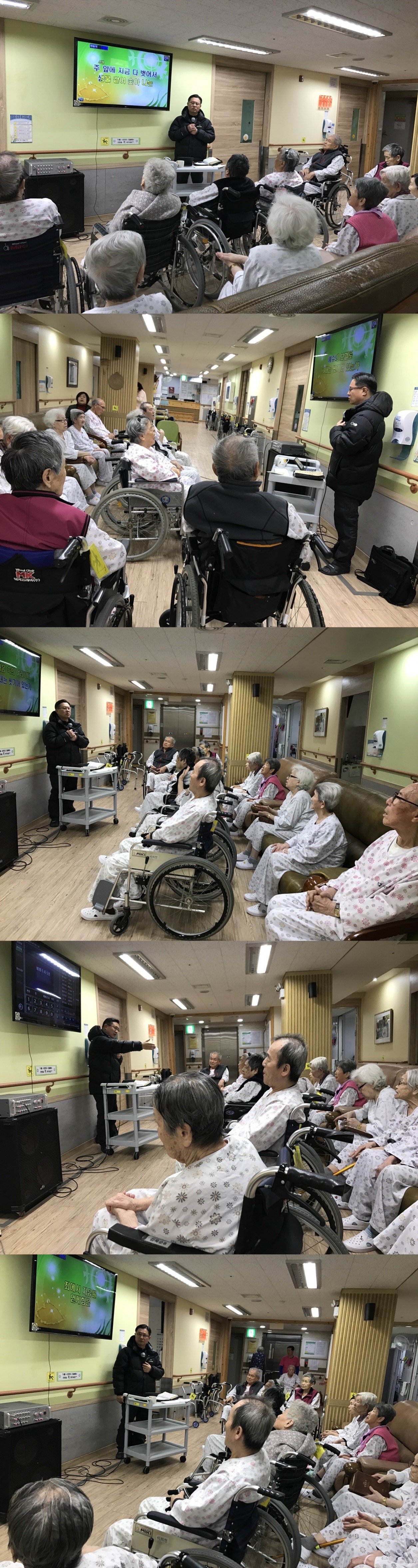 시흥SK요양병원에서는 주 1회 종교 활동 예배를 드리고 있습니다. 3월의 첫째주 예배시간에는 예배소서 5장 말씀과 ‘죄에서 자유를 얻게 함은’ 외 5곡의 찬송들을 통하여 환자분들과 열정적인 예배 시간이 될 수 있었습니다.
