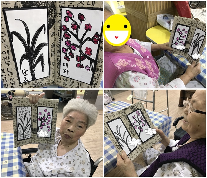 2017년 3월 마지막주의 미술심리프로그램 시간에 주제로 전통 문양이 있는 한지에 매화 꽃과 난초를 색칠하고 붙여보는 시간을 가졌습니다. 완정된 작품을 보시고 환자분들께서는 사랑하는 가족들에게 선물로 주겠다며 완성된 작품에 기뻐하시는 모습을 볼 수 있었습니다.